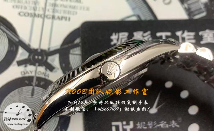腕表侧面的线条感非常强,右侧为嵌入式把头,把头上面的刻字清晰可见。表冠采用904L精钢材质,顶部雕浮着劳力士品牌Logo,无论大小深浅等方面都与原版一模一样。在使用腕表后,务必把把头转紧,以避免进水的尴尬。上链表冠具备劳力士专利双扣锁双重防水系统,牢固旋紧于表壳。