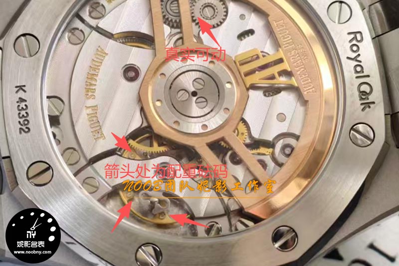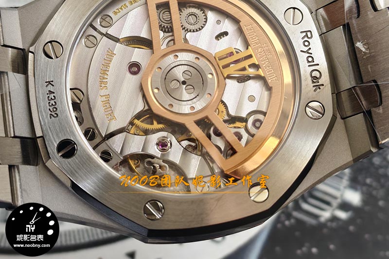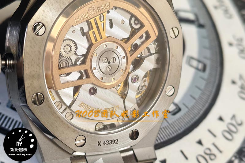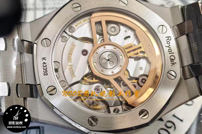 如果说外观复刻是“基本功”,那么机芯的升级才是APS厂此次的真正王牌。这款APS厂15510搭载了一体化的4302自动机械机芯,并且实现了两大关键突破:一是“无卡度游丝+配重砝码摆轮”结构。熟悉机芯的表友知道,无卡度调校方式通常用于高端机芯,通过摆轮上的砝码微调快慢,比传统快慢针系统更稳定、更精准。APS厂此次将这一结构直接融入一体机芯中,摆轮位置、砝码样式均贴近原版,无需后期单独改装。二是甲板打磨与自动陀细节。机芯甲板的日内瓦纹、鱼鳞纹打磨到位,自动陀上的AP字体雕刻圆润清晰,重量也经过配比,上链效率更足,动力储存表现更稳定。背透设计下,机芯的整体观感已远超普通复刻机芯的毛糙感,甚至让不少老玩家感叹“省去了以往升级机芯的额外花费”。
