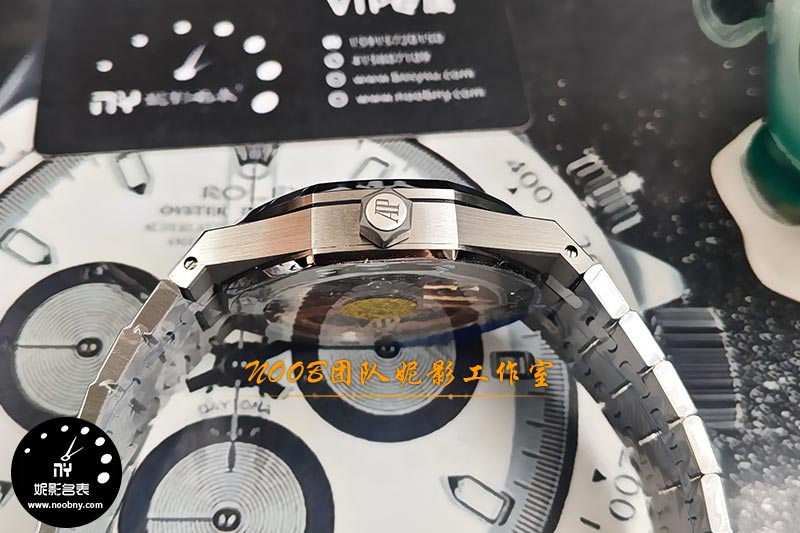 腕表尺寸为41mm,厚度把控接近原版,重量约152克,上手分量感十足,贴合多数人腕围。表壳采用316L精钢,经过多道工序的抛光和拉丝处理,线条硬朗且层次分明。尤其是表圈上经典的八颗螺丝,APS厂对其孔位、螺丝坡度及光泽都做了细致还原,这里提醒一点:这些是固定螺丝,切勿自行拧动。表盘方面,以黑色款式为例,APS厂重点还原了原版的“威化饼干”网格纹。放大细看,网格压纹均匀立体,线条清晰,与正品放在一起很难一眼区分。日历窗口采用4轴激光精雕,边缘工整,字体清晰。Logo及字母雕刻也十分讲究,例如“A”字长脚、“E”字中间斜角等细节均一一对应原版。蓝宝石镜面通透度高,且做了内外防眩晕镀膜,在不同光线下读时清晰,也抗刮耐磨。表壳侧面的“猪嘴”设计、拉丝纹理的走向,乃至表冠上的AP标志浮雕,APS厂都处理得相当流畅,整体质感已非常接近原版钢王的硬朗气质。