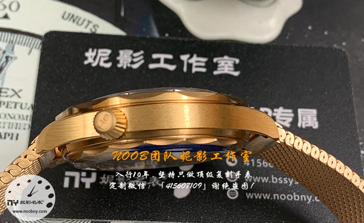 表壳侧面打磨得挺细致,左侧的HE排氦阀门可以转动,但实话说它不具备真实功能——毕竟复刻表也没人真戴着去潜水。右侧的表冠刻字清晰,旋入式设计保证了基本的防水性。这里提醒一下,平时锁把的时候别拧太紧,把管滑丝是很多复刻表出问题的根源。