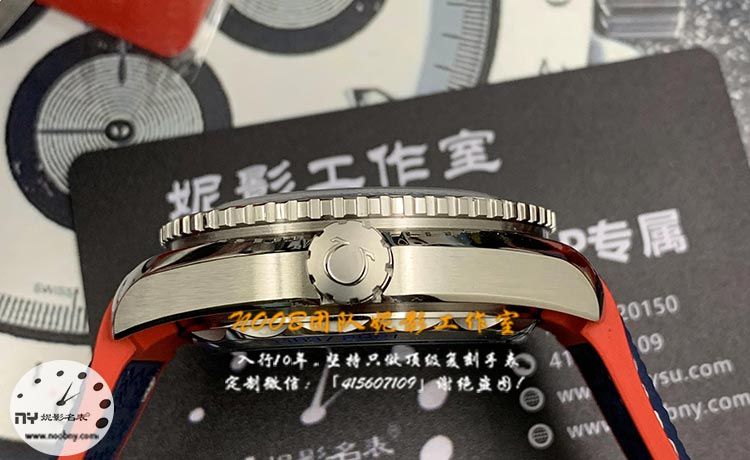 侧面经过光滑精美的拉丝处理,不仅提升了整体的运动质感,更在细节上展现了VS厂对品质的追求。表冠两侧的护肩设计不仅提供了额外的保护,更在操作时提供了稳定的握持感。表冠上的欧米茄品牌logo和防滑纹路更是将精致与实用完美地结合在一起。